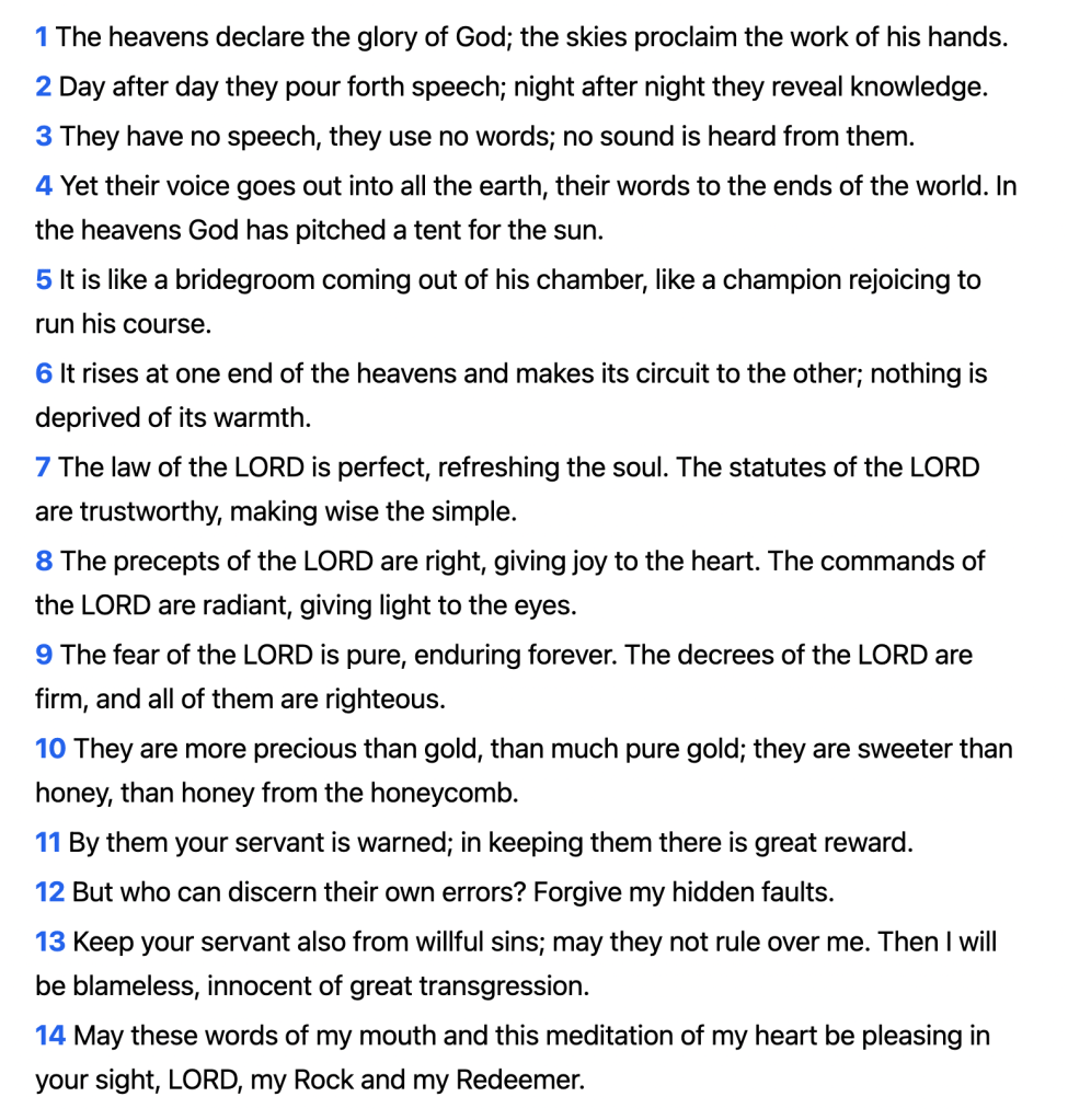 Beginning in verse 1 we are going to read through the whole chapter of Psalm 19